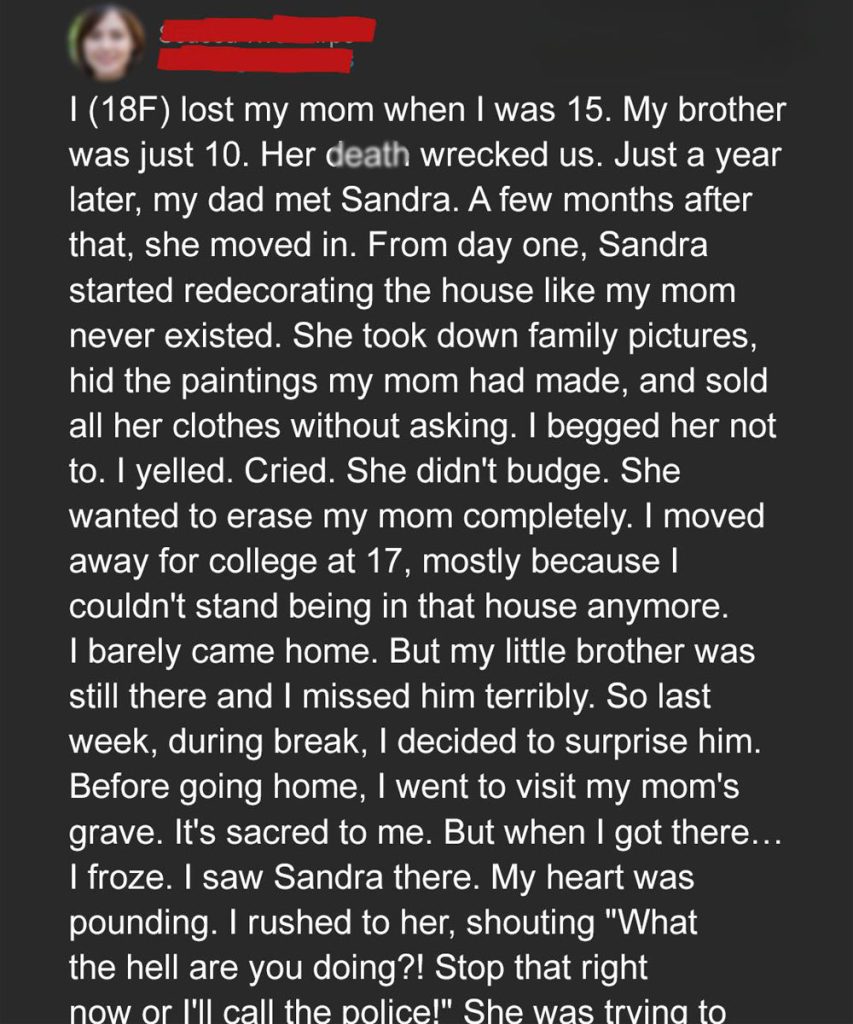I wasn’t prepared to see Sandra there—kneeling in the dirt at my mother’s grave, her hands buried in soil.