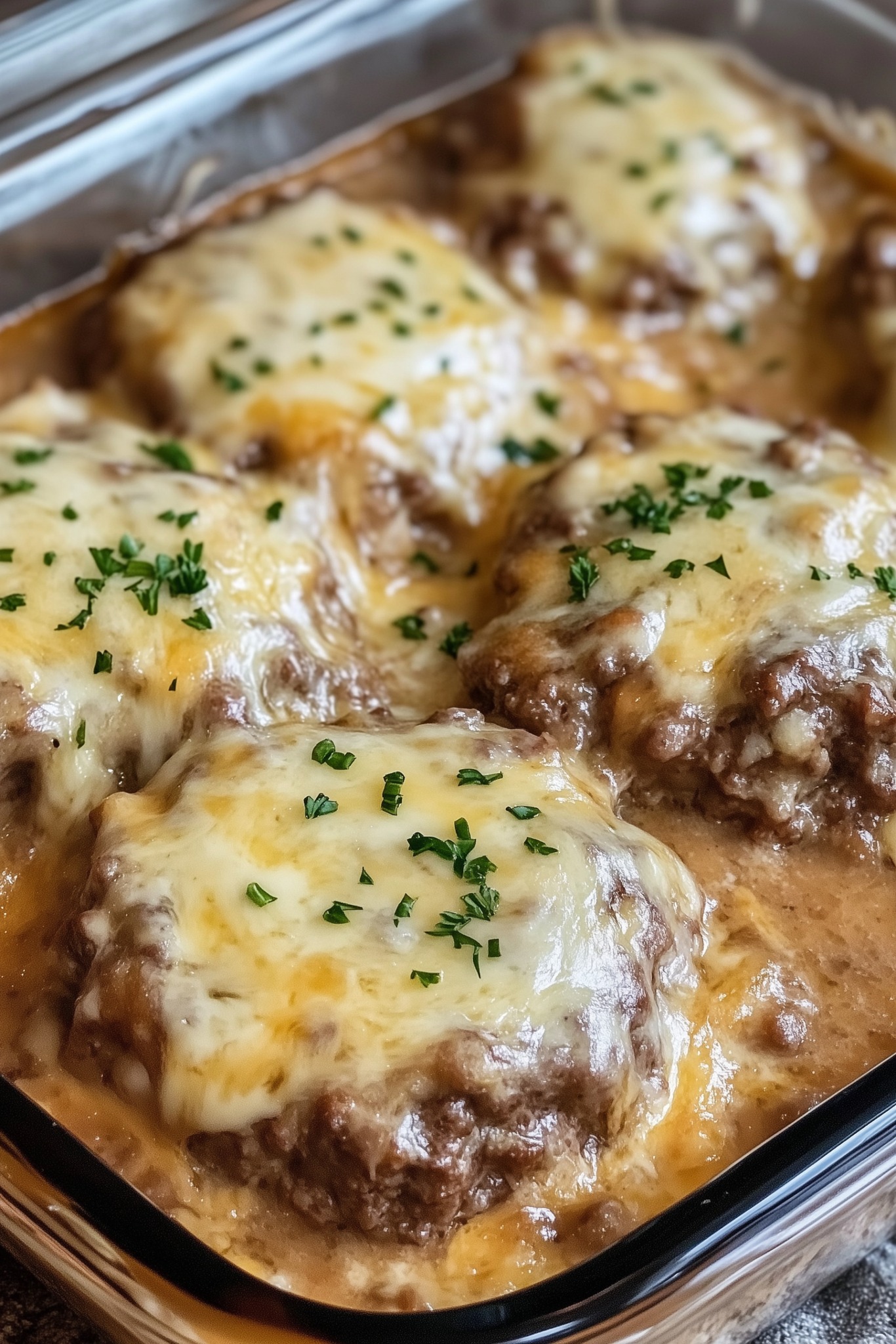 A comforting, all-in-one casserole where seasoned hamburger steaks are nestled with potatoes and onions in a creamy gravy, then topped with melted cheddar cheese. It’s hearty, satisfying, and perfect for a family dinner.