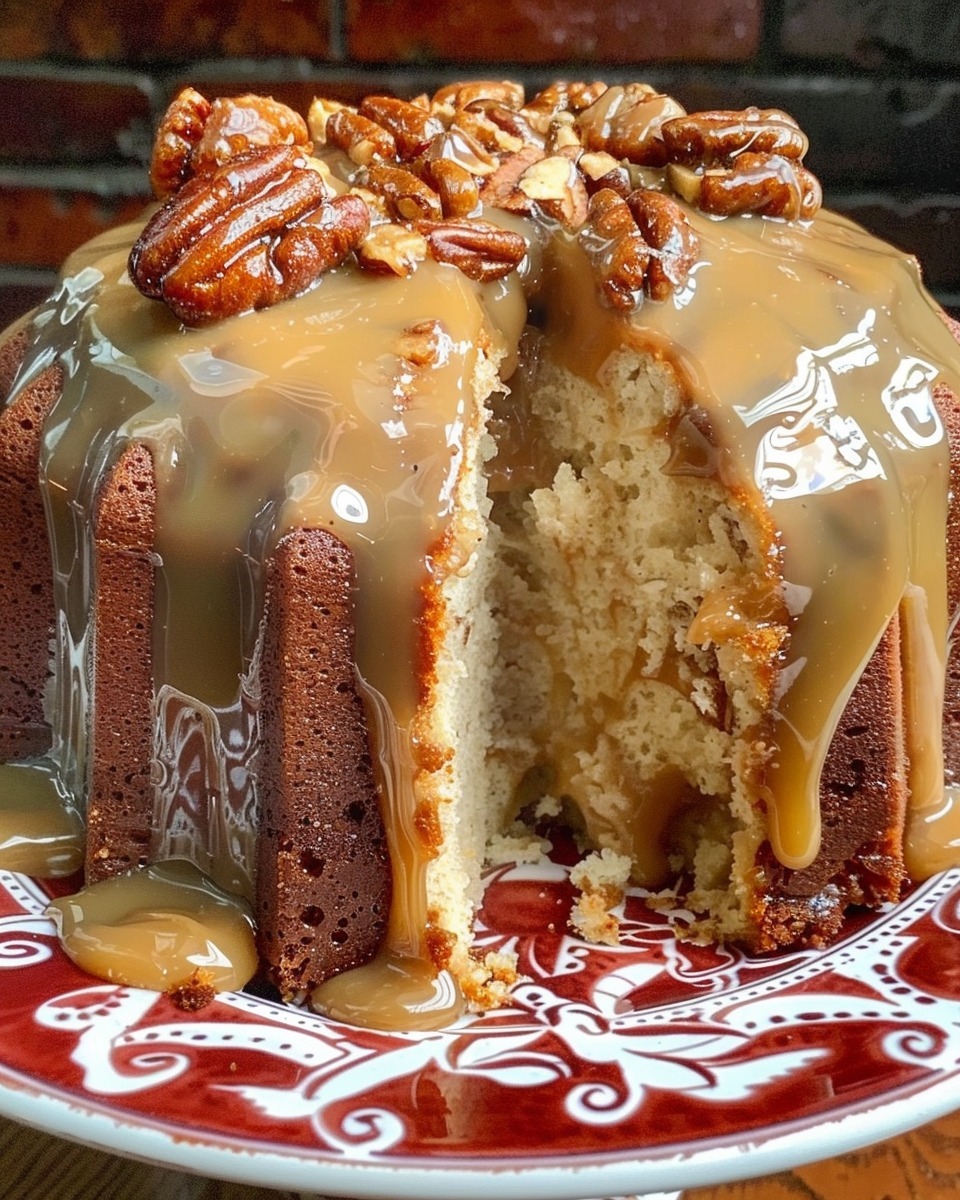 This decadent pound cake is incredibly moist and rich, featuring a deep caramel flavor that’s enhanced by a glossy caramel glaze and a crunchy, candied pecan topping.