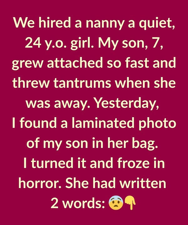 Yesterday, I found a laminated photo of my son in her bag. At first, I thought it was sweet. But then, I turned it and froze in horror. She had written 2 words: “MY son.” I was confused and decided to wait until her next visit to ask what it meant.But that same night, I got a frantic call from a mom. She said, “This girl is planning to take over your family.