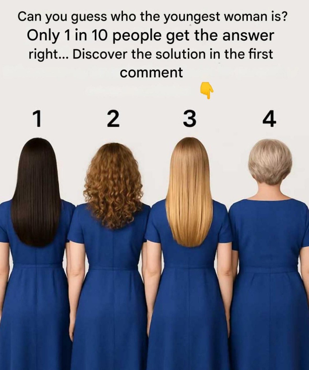 In the age of social media, a simple image can spark intense debate, going viral within hours and inspiring hundreds of comments, shares, and even memes. One such image has captivated the internet for its deceptively simple question: “Four women, four backs turned, four very different hairstyles… and only one question: who is the youngest?” At first glance, this may seem like a straightforward observation test. But appearances can be deceiving. To solve this riddle, one must look beyond the obvious and pay attention to subtle cues.