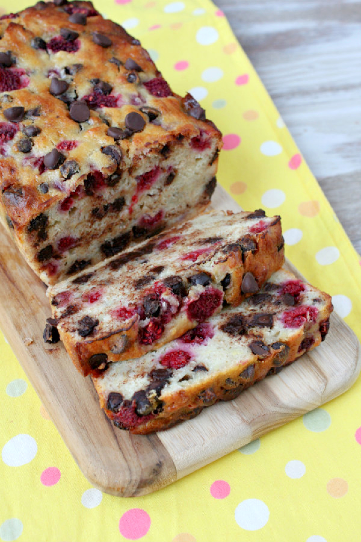 loaf of raspberry dark chocolate banana bread on yellow cloth